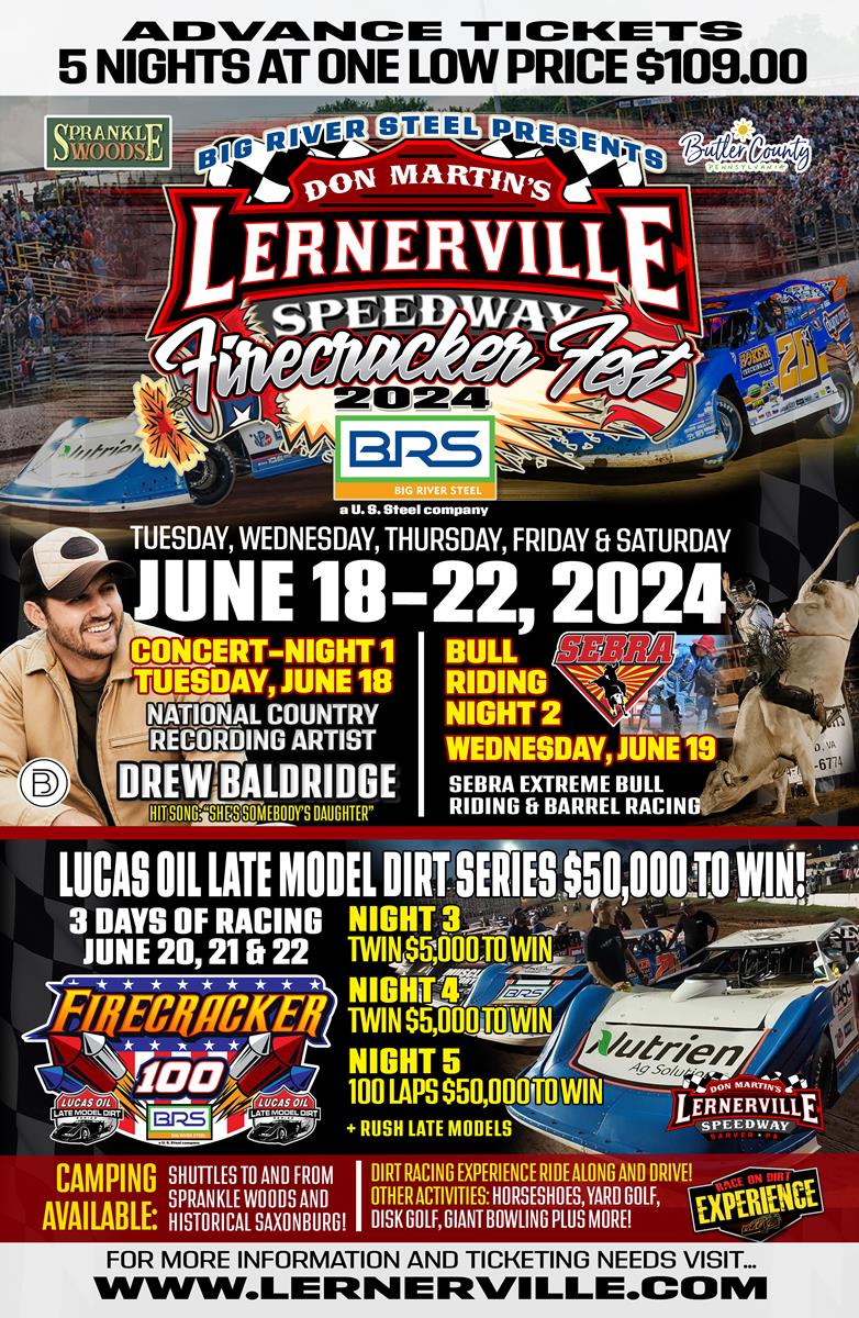 In addition to traditional ticketing options, fans can enjoy all five nights of action, (the concert, the rodeo and all three nights of racing) for just $109! Five-day event tickets are available online now at www.Lernervilletickets.com. Where else can your purchase five nights of family fun entertainment for just over $20 per day?!
